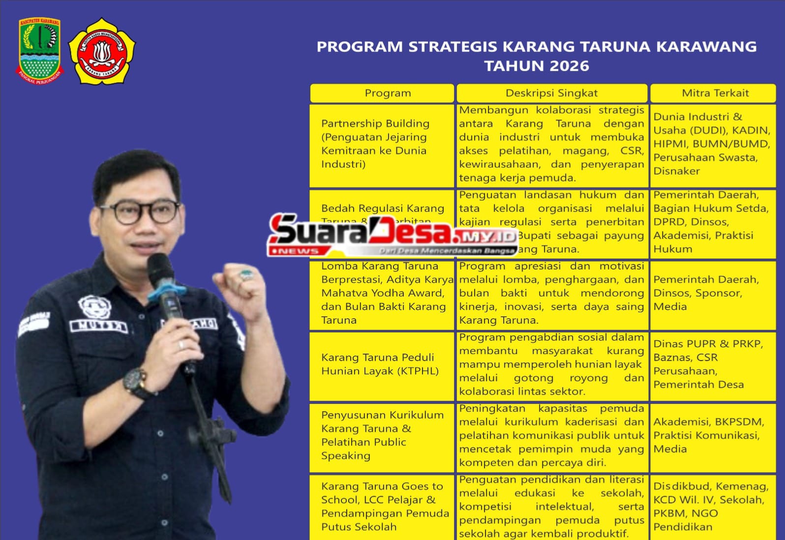 Sementara itu, program Bedah Regulasi dan Penerbitan Perbup Karang Taruna bertujuan memberikan kepastian hukum, legitimasi, serta dukungan kebijakan yang berkelanjutan bagi Karang Taruna. Program Lomba Karang Taruna Berprestasi dan Aditya Karya Mahatva Yodha Award dirancang berbasis prinsip reward and recognition untuk mendorong inovasi dan daya saing organisasi di seluruh wilayah Kabupaten Karawang.