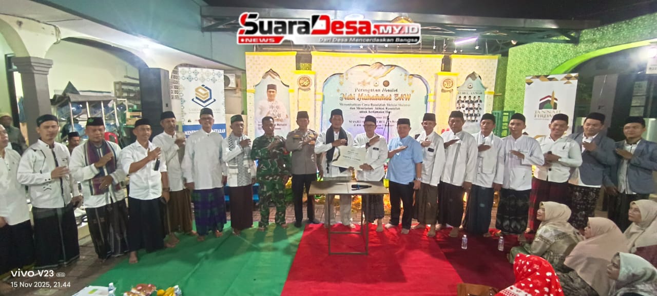 KARAWANG — Peringatan Maulid Nabi Muhammad SAW di Masjid Nurul Anwar, Sadamalun RW 14, Kelurahan Nagasari, Kecamatan Karawang Barat, berlangsung khidmat dan meriah pada Sabtu malam (15/11/2025). Acara yang digelar sebagai wujud cinta kepada Rasulullah ini mendapatkan sambutan hangat dari masyarakat, yang hadir memenuhi area masjid.